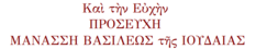 | Greek 2 (later) | ![]() Prayer of Manasseh: Septuagint version Found in the Horologion for Great Compline (identical with the text in the Odes) -in Greek | ΠΡΟΣΕΥΧΗ ΜΑΝΑΣΣΗ Μεγαλο Αποδειπνο. [p: 18]; ΠΡΟΣΕΥΧΗ ΜΑΝΑΣΣΗ ΒΑΣΙΛΕΩΣ τῆς ΙΟΥΔΑΙΑΣ ΜΕΓΑ ΑΠΟΔΕΙΠΝΟΝ. [p: 36]; Προσευχή Μανασσή ΜΕΓΑ ΑΠΟΔΕΙΠΝΟΝ | |